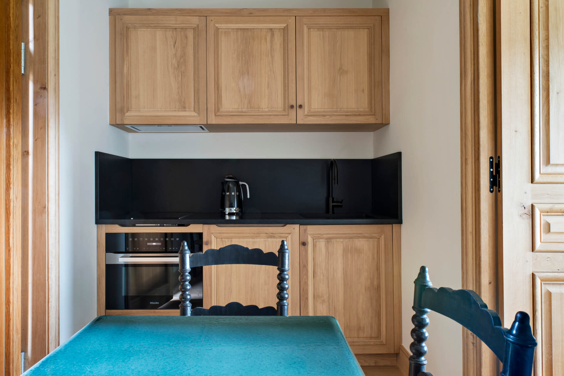 The property includes an independent studio with a 140×200 cm bed. It features a small kitchen, a dining table, and a bathroom, all finished with the same high-quality materials as the main house—ideal for staff, teenagers, or friends.