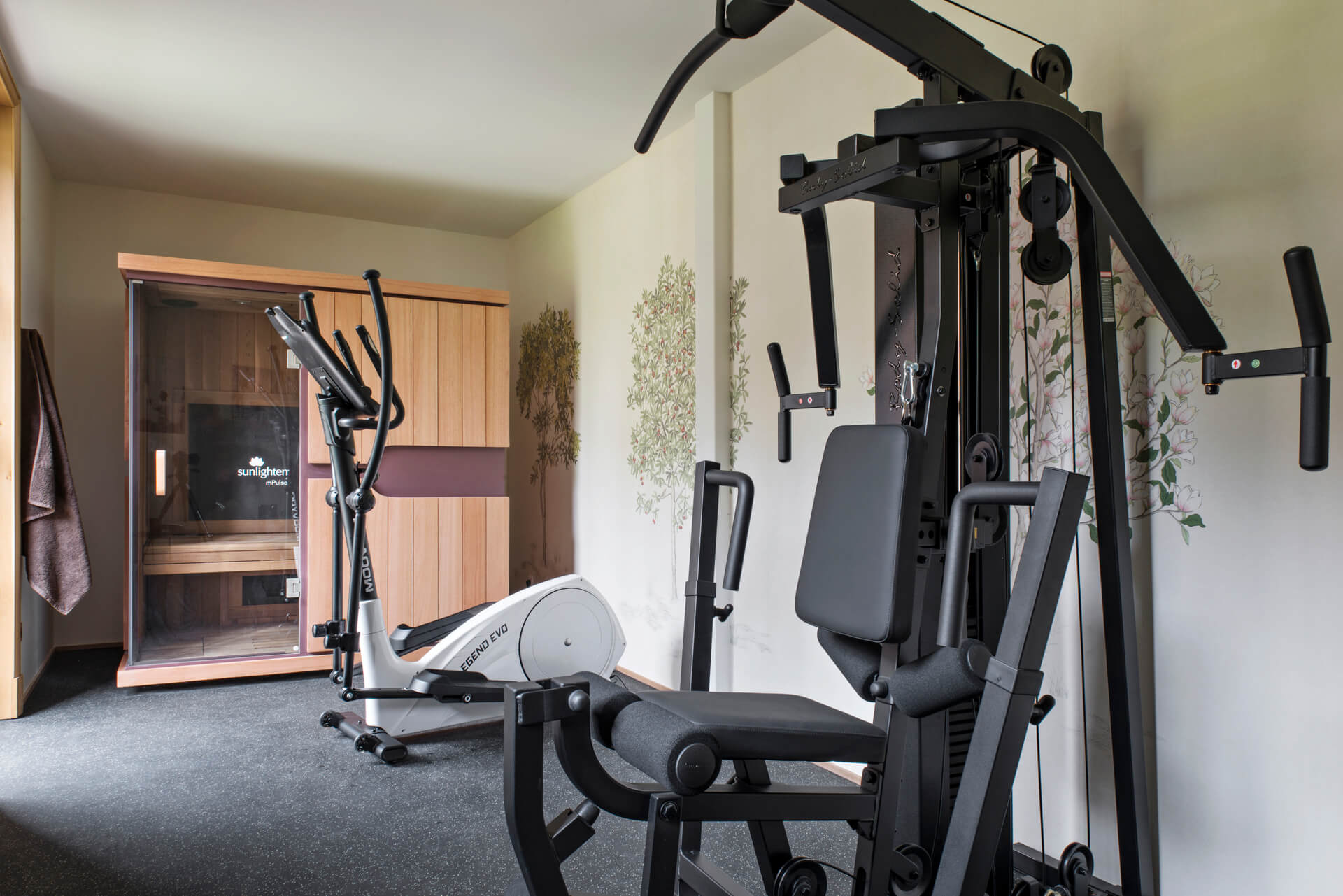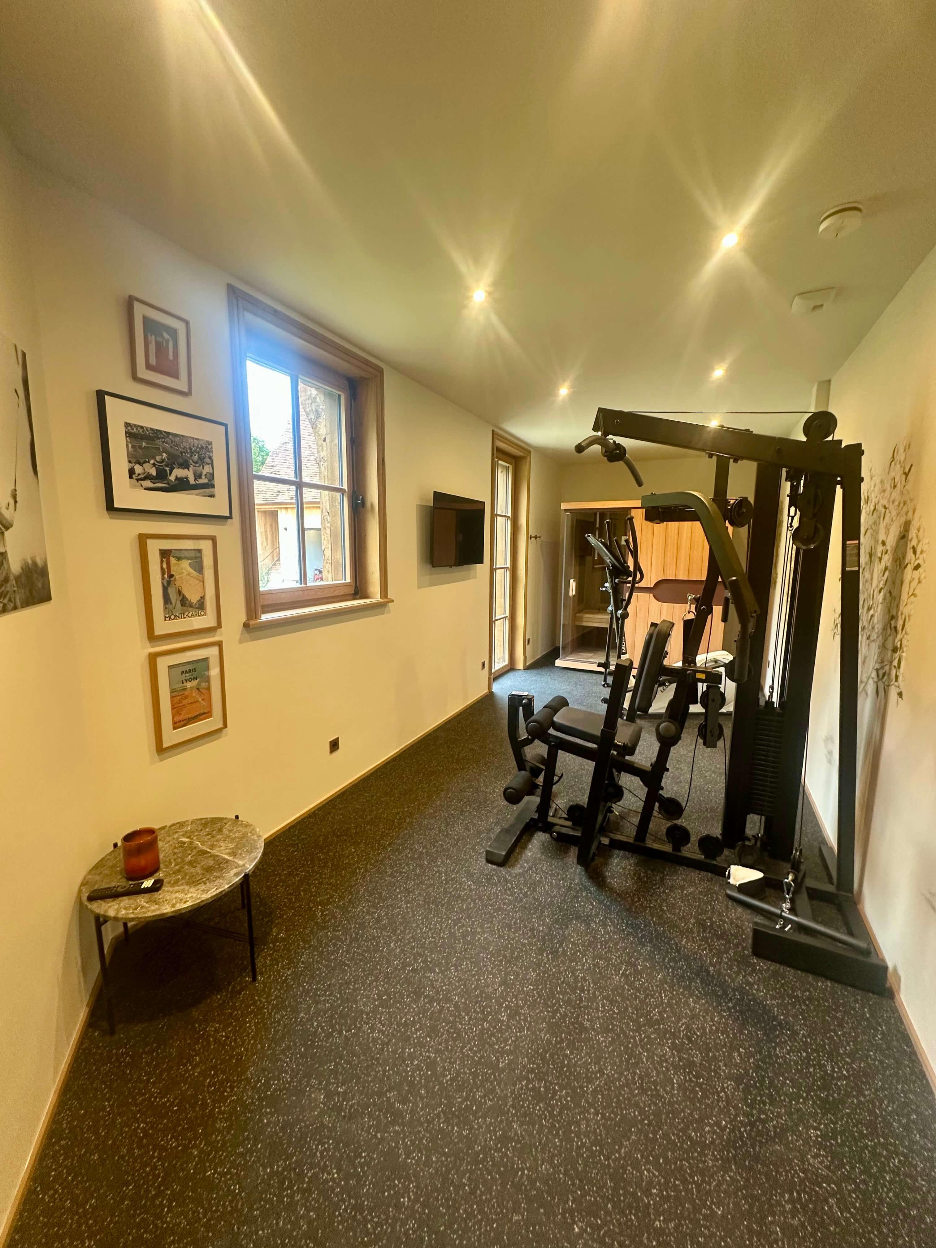 Equipped with an elliptical trainer, a weight machine, and an infrared sauna.